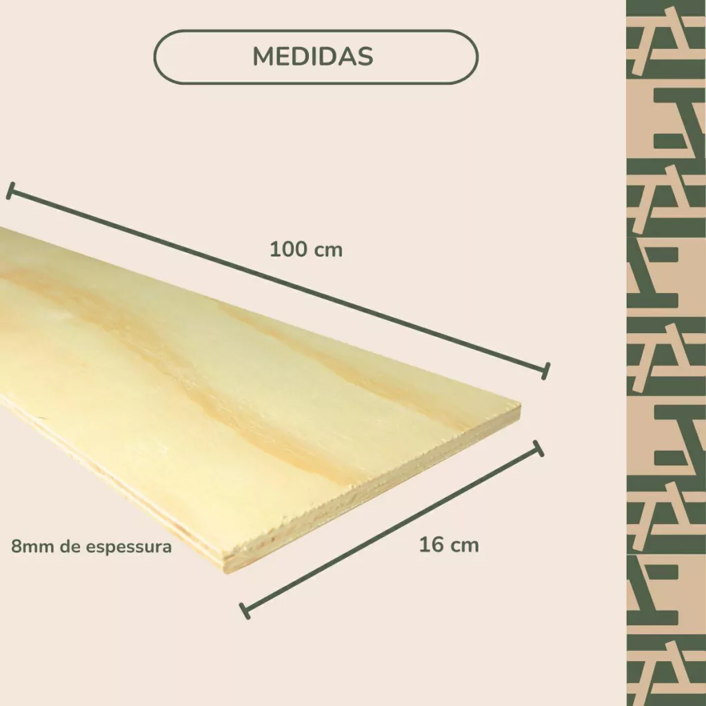 Adquira este kit de compensado de Pinus, perfeito para quem precisa de peças longas e finas. O compensado é um material versátil e resistente, proveniente de madeira reflorestada, ideal para projetos que exigem estabilidade e uma superfície lisa para acabamento.