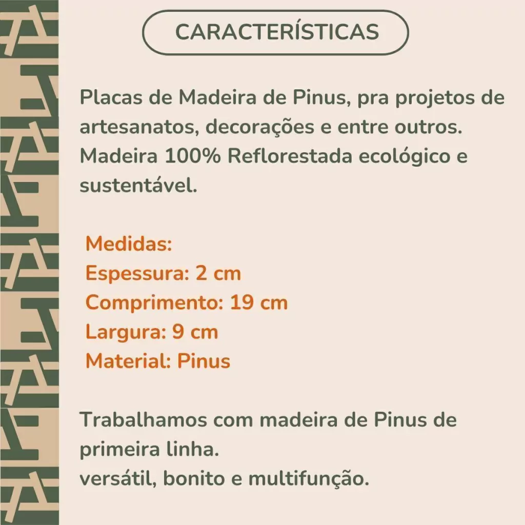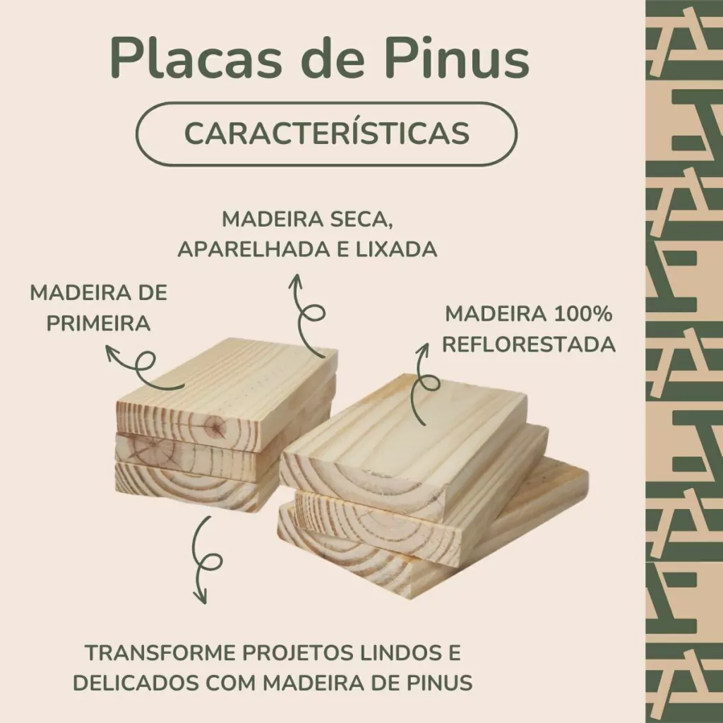 Se você é artesão, marceneiro ou entusiasta do "faça você mesmo" (DIY), este kit é a base perfeita para seus projetos. Nossas Placas Retangulares de Madeira Pinus são resistentes, leves e ideais para uma variedade de criações.