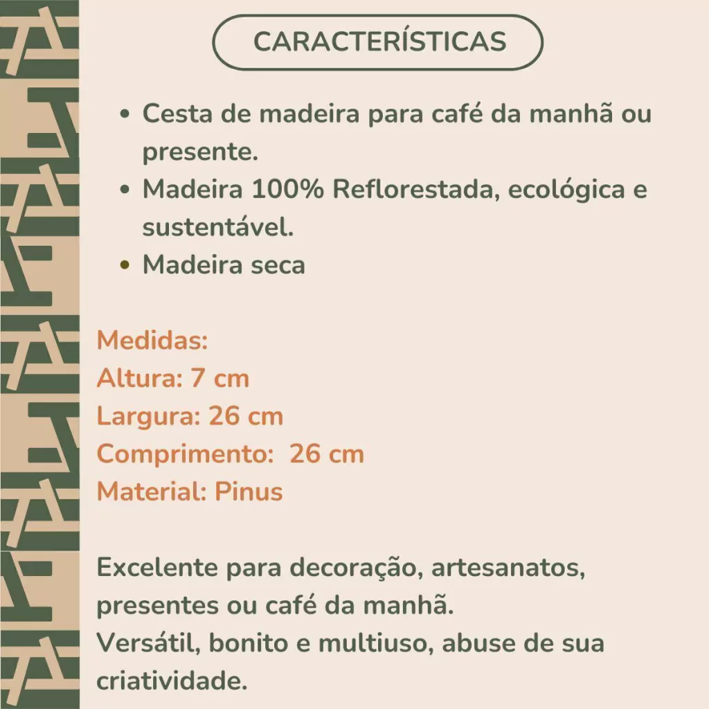 Com design funcional e alça confortável, facilita o transporte e exibe seus produtos gourmet com requinte. Ideal para montar kits presentes, cestas de café da manhã, ou produtos artesanais, valorizando ainda mais o conteúdo.