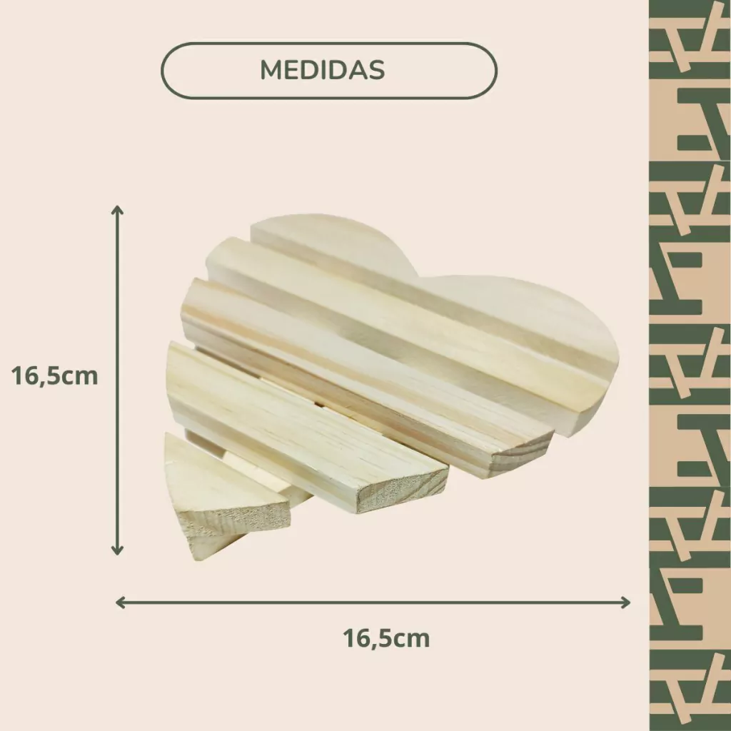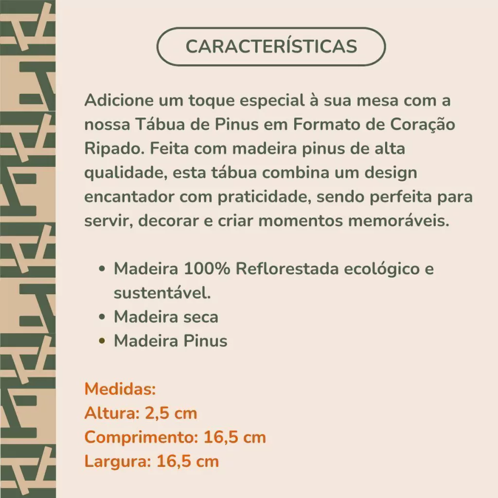 Adicione um toque de afeto e estilo rústico à sua cozinha e mesa com o Descanso de Panela em Formato de Coração. Feito em Madeira Pinus Ripado de alta qualidade, esta peça não apenas protege seus móveis do calor, mas também serve como um lindo item decorativo.